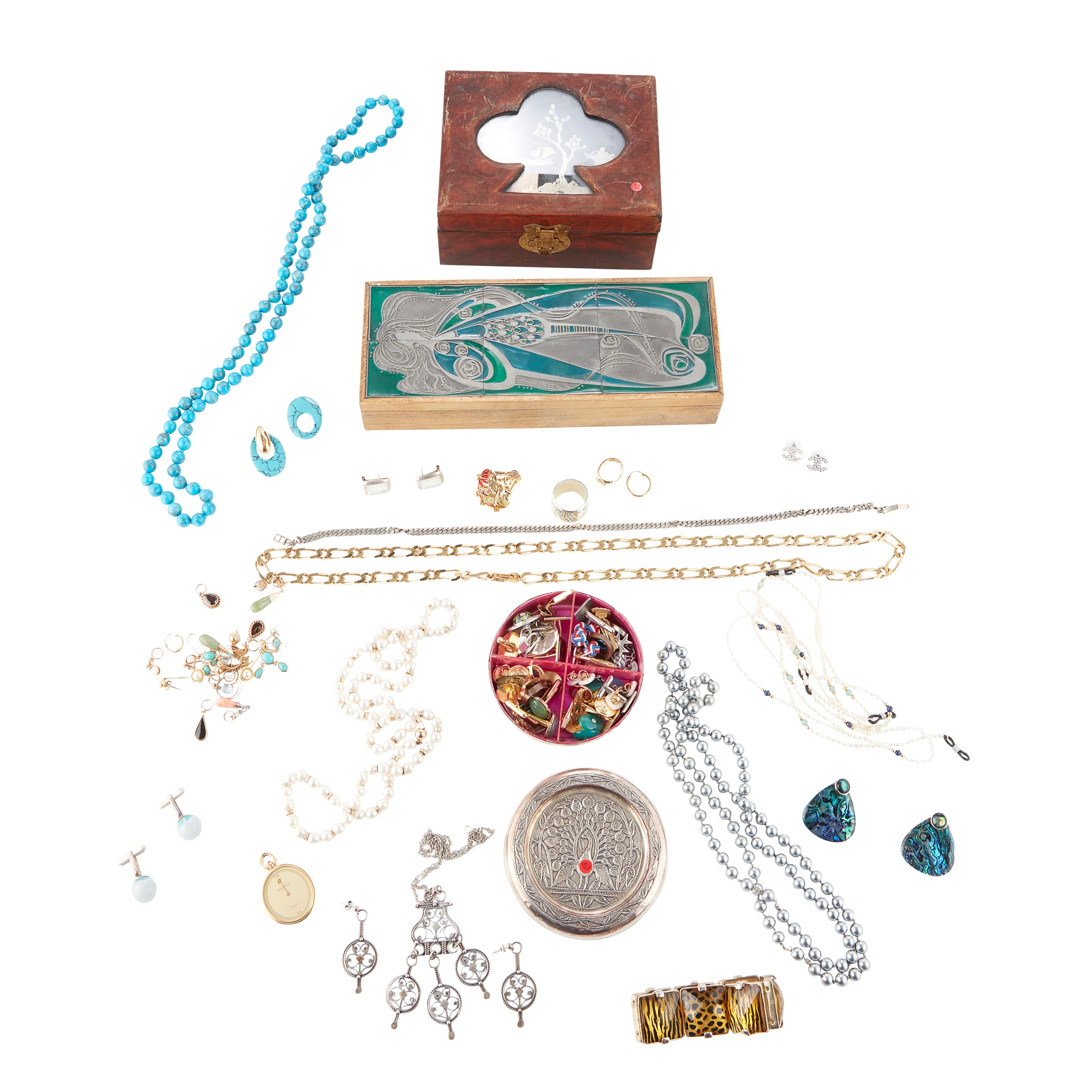 to include two pairs of Chanel cultured pearl or paste set earrings, a cultured pearl necklace with yellow metal spacers; an enamel pendant necklace and earring set, signed 'Michaela Frey Team'; various pairs of pearl, turquoise, garnet or gem set earrings; together with various hardstone and gem set beaded necklaces, wrist watches, a quantity of costume earrings, brooches, rings