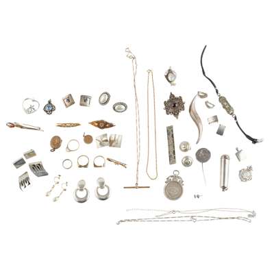 to include a 9ct modernist diamond set ring, a 9ct gold modernist aquamarine set ring; a Victorian 9ct gold sapphire and diamond set bar brooch, and another unmarked set with pearls; a Victorian floral brooch and a pearl set ring, both stamped 9ct; a 9ct gold fancy link chain and T-bar pendant; a pair of stylised square earrings, by Lapponia; various other silver earrings, pendant and brooches etc