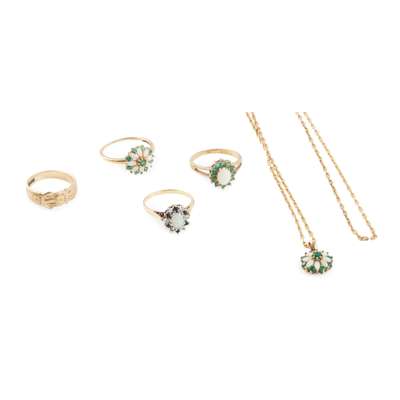 to include an opal and emerald set pendant necklace and matching ring, stamped 9k; a 9ct gold opal and emerald set cluster ring, an 18ct gold opal and sapphire set cluster ring, and a 9ct gold buckle ring