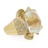 claw set with a fancy cushion-cut aquamarine, the gallery modelled as an opening bud, pavé set throughout with alternating round-cut coloured diamonds, to a plain yellow metal broad shank stamped 750
