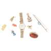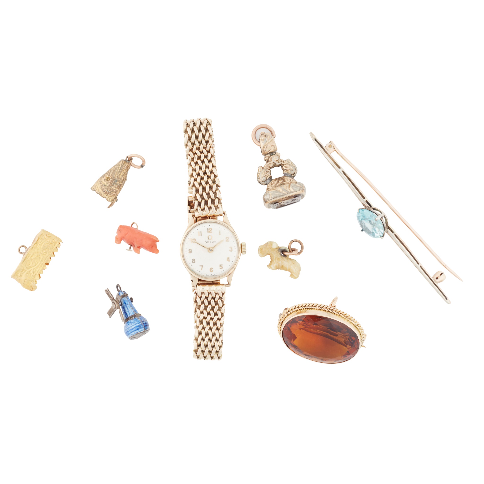 to include a 9ct Omega wristwatch, a citrine set brooch and a blue zircon set bar brooch, both unmarked; various charms and a citrine set seal fob