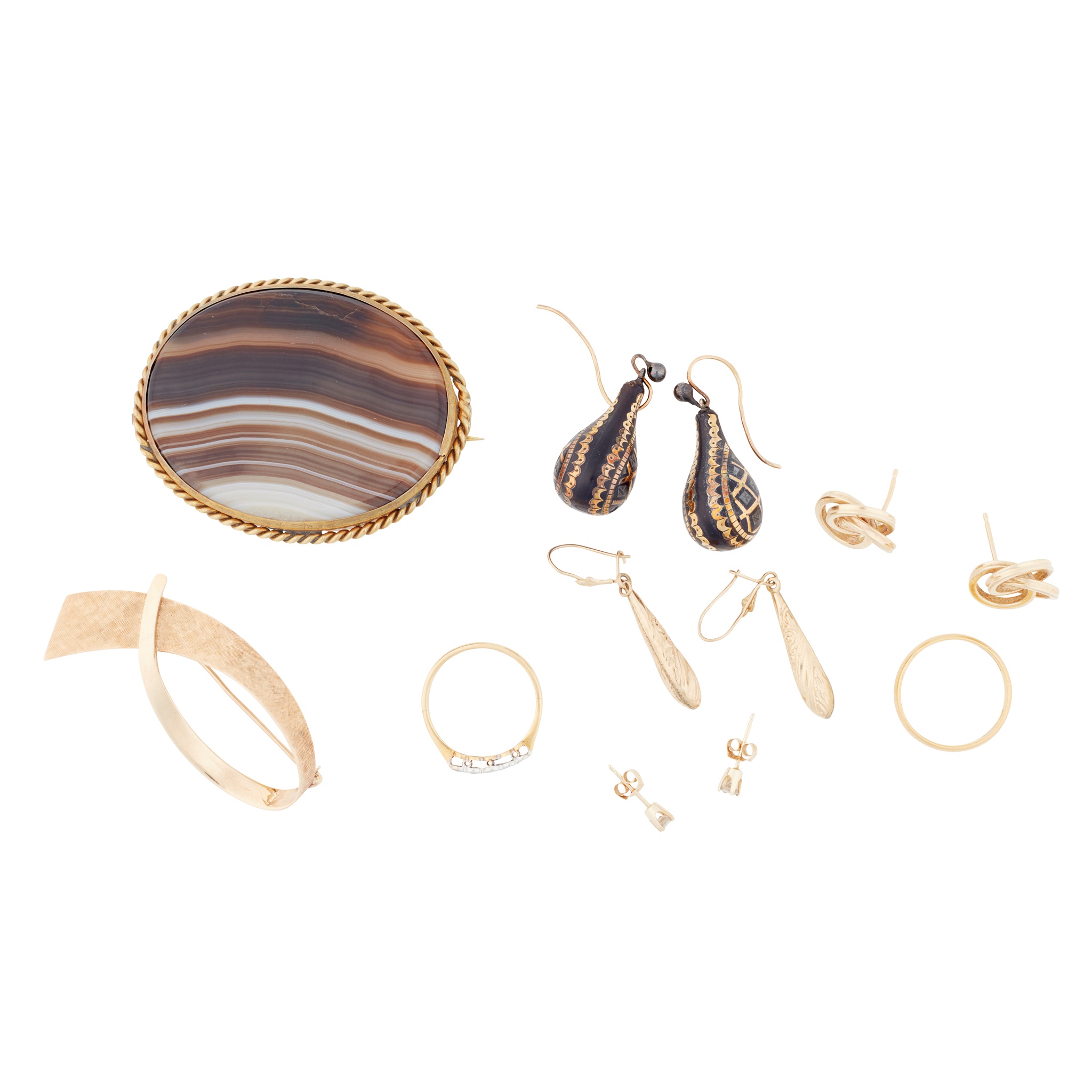 to include an unmarked banded agate set brooch, a stylised swirl brooch stamped 14K; a five stone eight-cut diamond set ring, to a yellow metal shank stamped 18K PLAT, a 22ct wedding band; together with a pair of piqué work pendant earrings and another similar cast pair stamped 9K, a pair of diamond set studs, the post stamped 14K and a pair of unmarked knotted earrings
