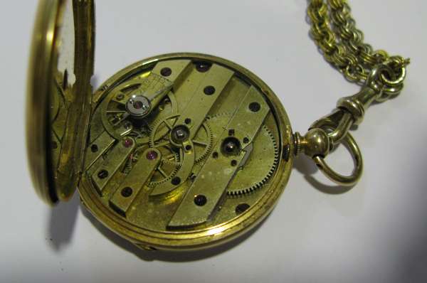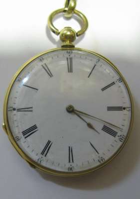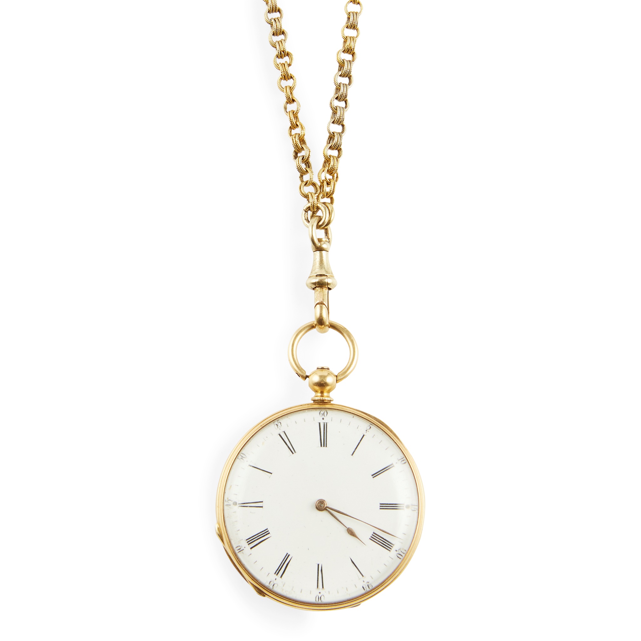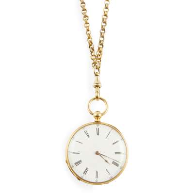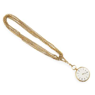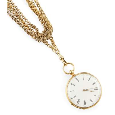 A mid-19th century French gold and enamelled fob watch and a chain
