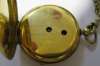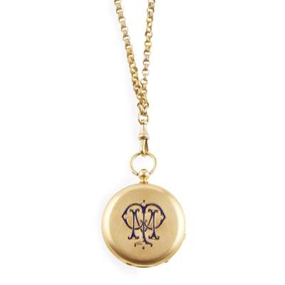 the watch open faced and key wind, white enamel dial with Roman numerals, engine turned rear cover with onset enamel monogram, cuvette engraved Le Roy et Fils, the rear inner cover engraved initials and dated March 1864, with a long yellow metal muff chain