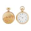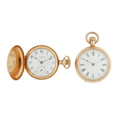 the 14k watch with C-scroll engraved case, the enamel dial with Arabic numerals, and inscribed Ball Watch Co. Cleveland, subsidiary seconds dial, keyless wind lever movement, the other watch of similar size, gold plated open faced case, keyless wind and with a small Victorian watch key