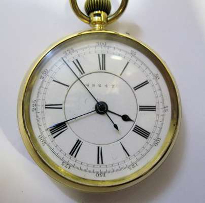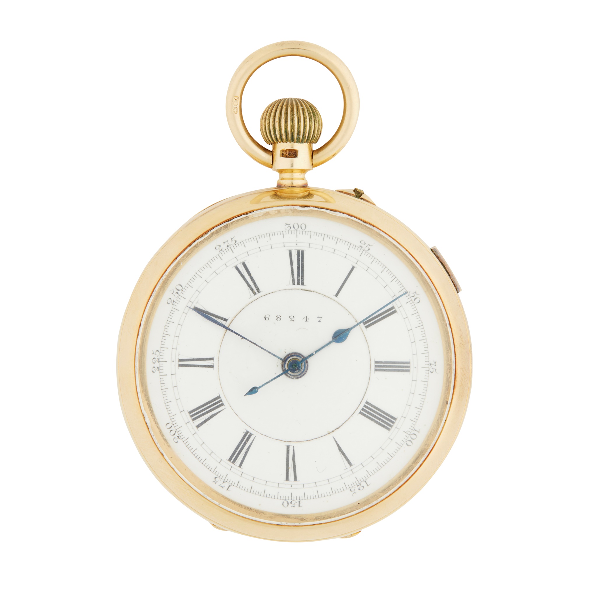 open faced, keyless wind, with white enamel dial, principal Roman numerals, dial numbered 68247, with sweep second hand, stop start button to side, plain case, gold cuvette, three quarter plate movement, bi-metallic balance, numbered as dial