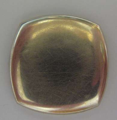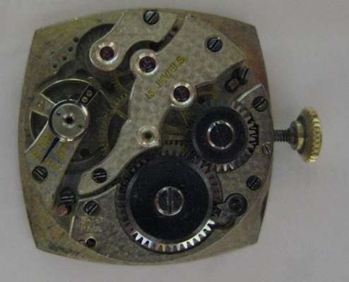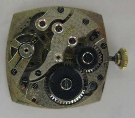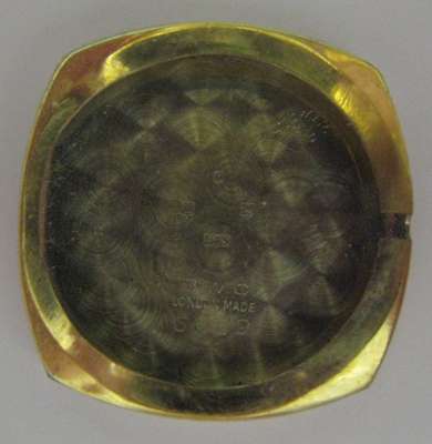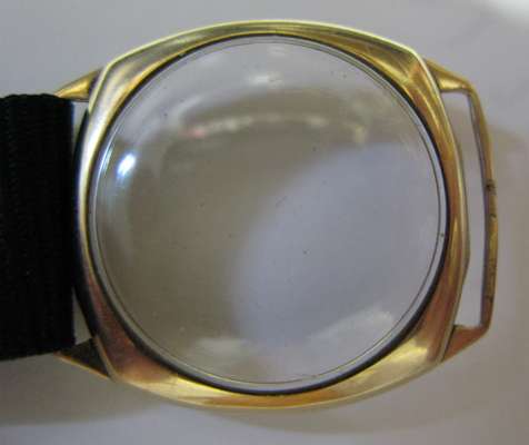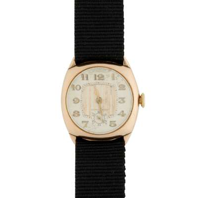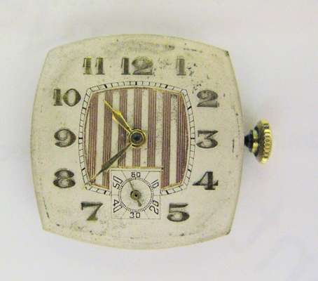 the round dial with gilt central field, subsidiary seconds hand, gilt Arabic numerals, cushion shaped case with cloth strap, gilt metal buckle