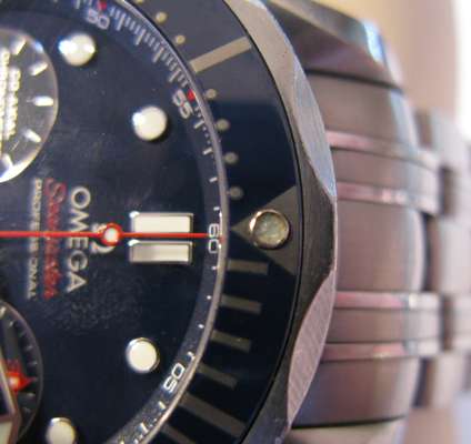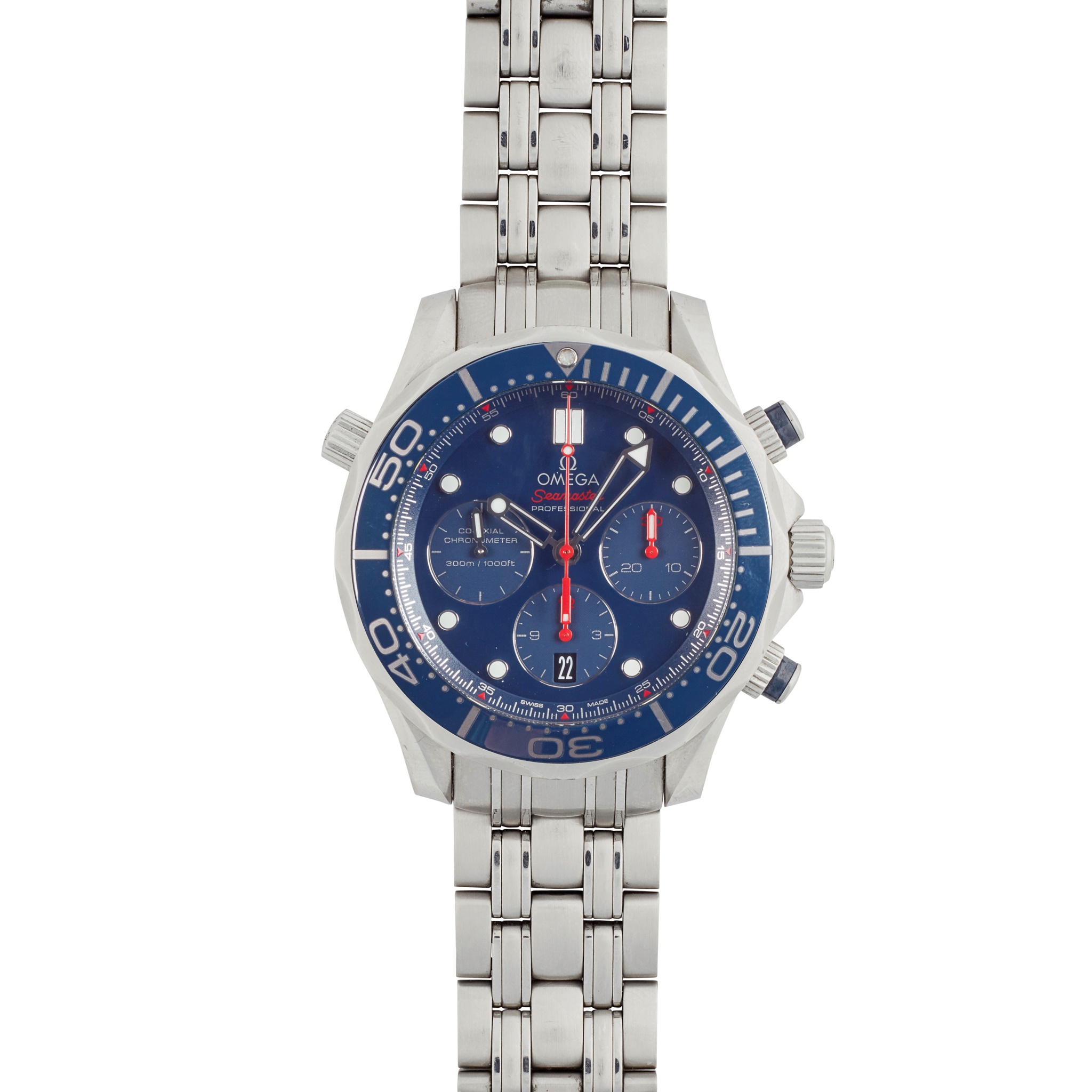 Seamaster Professional Co-axial Chronometer, dark navy blue dial, and subsidiary dials with red hands, date aperture, rotating bezel, screw down winder, helium release valve, stainless-steel bracelet with fold over clasp , in presentation wood case