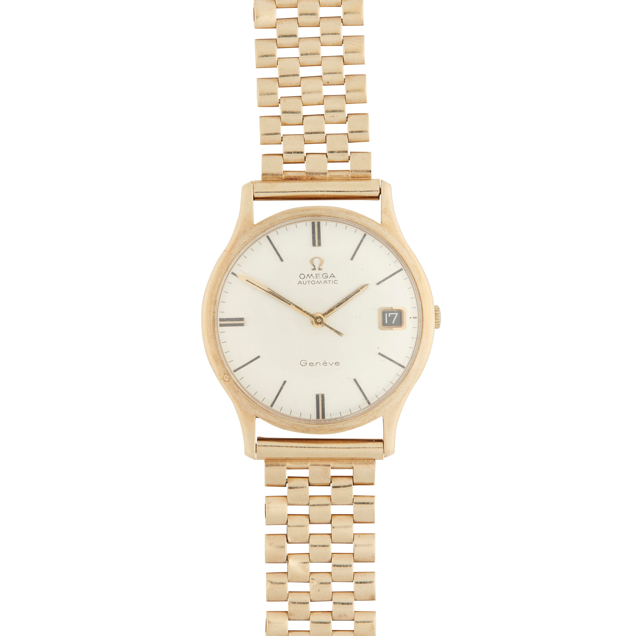 Geneve, plain silvered dial, date aperture with sweep second hand, baton indicators, automatic movement, polished link gold bracelet with fold over clasp