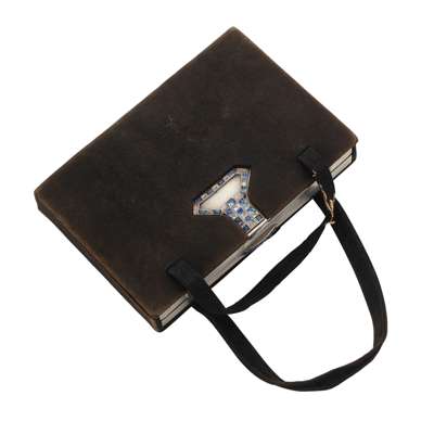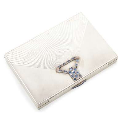 London 1935, of rectangular outline with engine turned detail, applied alternating blue and white paste gems in a geometric shape to centre, the thumb piece set with a row of calibre cut blue paste gems, opening to reveal a fitted mirror, three-covered compartments, three open compartments and one with powder, stamped ASPREY/ LONDON, in a fitted fabric case with handles