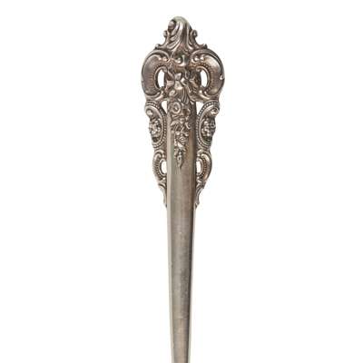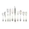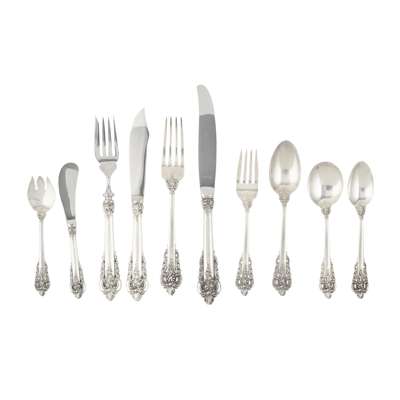 the oak canteen containing four drawers, each with a green velvet lining, the hinged lid revealing various serving accoutrements including carvers, spoons and a cake comb; the drawers containing, twelve fish knives, twelve fish forks, twelve table forks, twelve table knives, twelve dessert spoons, twelve dessert forks, twelve coffee spoons, twelve consommé spoons, twelve shellfish forks, twelve butter knives and twelve pastry forks; all of double struck Rococo scrolls and floral detail with engraved italic B to reverse of terminal, stamped WALLACE STERLING, retailed by Shreve & Co. San Francisco