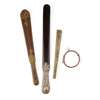 apparently unmarked, the handle with swirling embossed roses, to a wooden blade; together with a 19th century Indian metal page turner with gold detail; a parasole handle with inlaid Toledo decoration depicting mythological animals in scrolling and floral borders and an unmarked dog collar