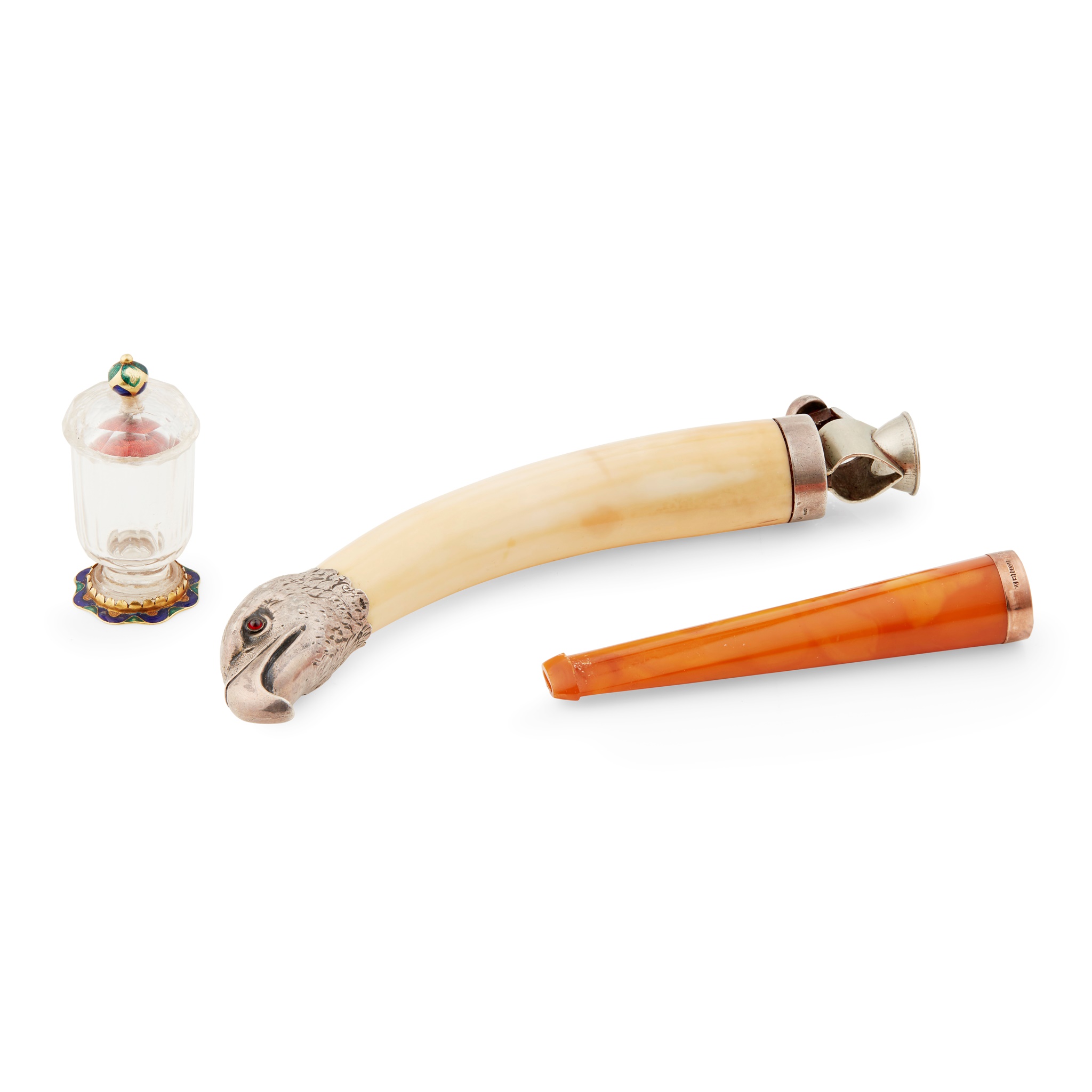 possibly walrus tooth, terminating with a silver eagle head with red paste set eyes; together with a 9ct gold mounted resin cigar holder; and an enamel set miniature cup and cover