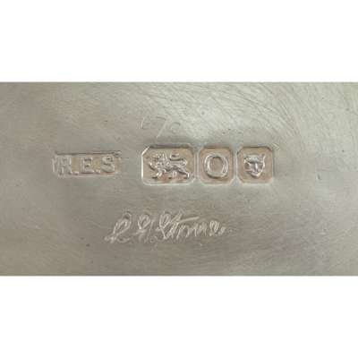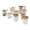 Robert Edgar Stone, London 1949 and facsimile signature, of tapered oval form, engraved to the body with a depiction of Hickory Dickory Dock nursery rhyme, raised on a moulded oval foot and stylised angular handle; together with a three various christening mugs and a set of five imported liquor beakers with a beaded border