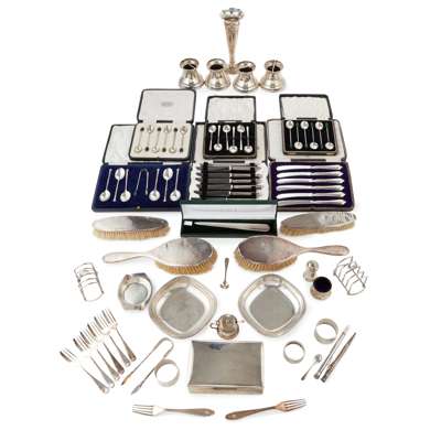 to include; three cased sets of coffee spoons, two sets of tea knives, a set of six teaspoons and tongs, a modern paperknife of plain tapering form; together with a salt with liner, ashtrays, pain trays, a pepper pot, a pair toast racks, a spill vase; various dressing table brushes, a table cigarette case etc.