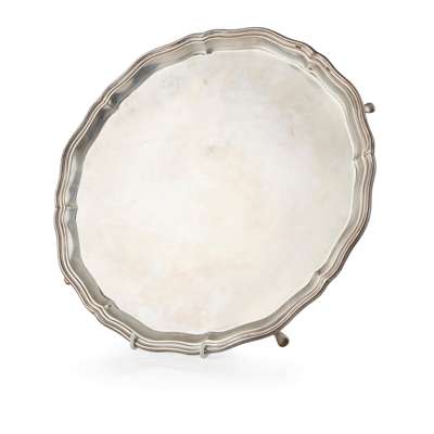 Albert Faulkner, Sheffield 1918, retailed by J. Bartleman & Son, Edinburgh, of moulded circular outline, the raised border with threaded detail, raised on four bracket and paw feet