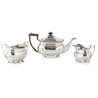 John William Page, London 1913, comprising tea pot, sugar and cream, of rounded form, ribbed border, plain body
