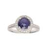 claw set with a round-cut purple sapphire, in border of round brilliant-cut diamonds, the shoulders similarly set each with seven round brilliant-cut diamonds, to a plain 18ct white gold shank