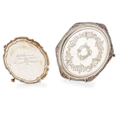 Henry Atkins, Sheffield 1905, of circular form, cast gadroon border, shell clasping, foliate engraved flat with blank cartouche, raised on three shell feet, with a small waiter, 1976 and engraved inscription, moulded border, raised on scroll feet