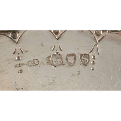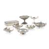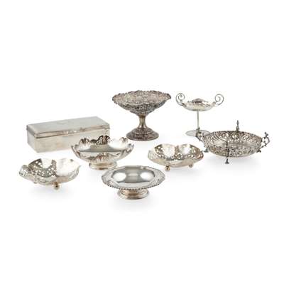 to include, a table cigarette box, London with foliate D engraved to lid; a pair of moulded pierced baskets, William Adams Ltd., Birmingham 1947, raised on three ball feet; a tazza, Charles Edwards, London 1894, of circular form, all over embossed vine and acanthus decoration, raised on a spreading foot (loaded); a footed dish, Viner's Ltd., Sheffield 1947, of circular form, pierced shell border; together with a four handled bon bon dish Charles Edwards, London 1893, of circular form, the cast handles modelled as sea monsters; together with a twin handled stylised trophy and a plated dish with gadrooned border