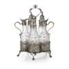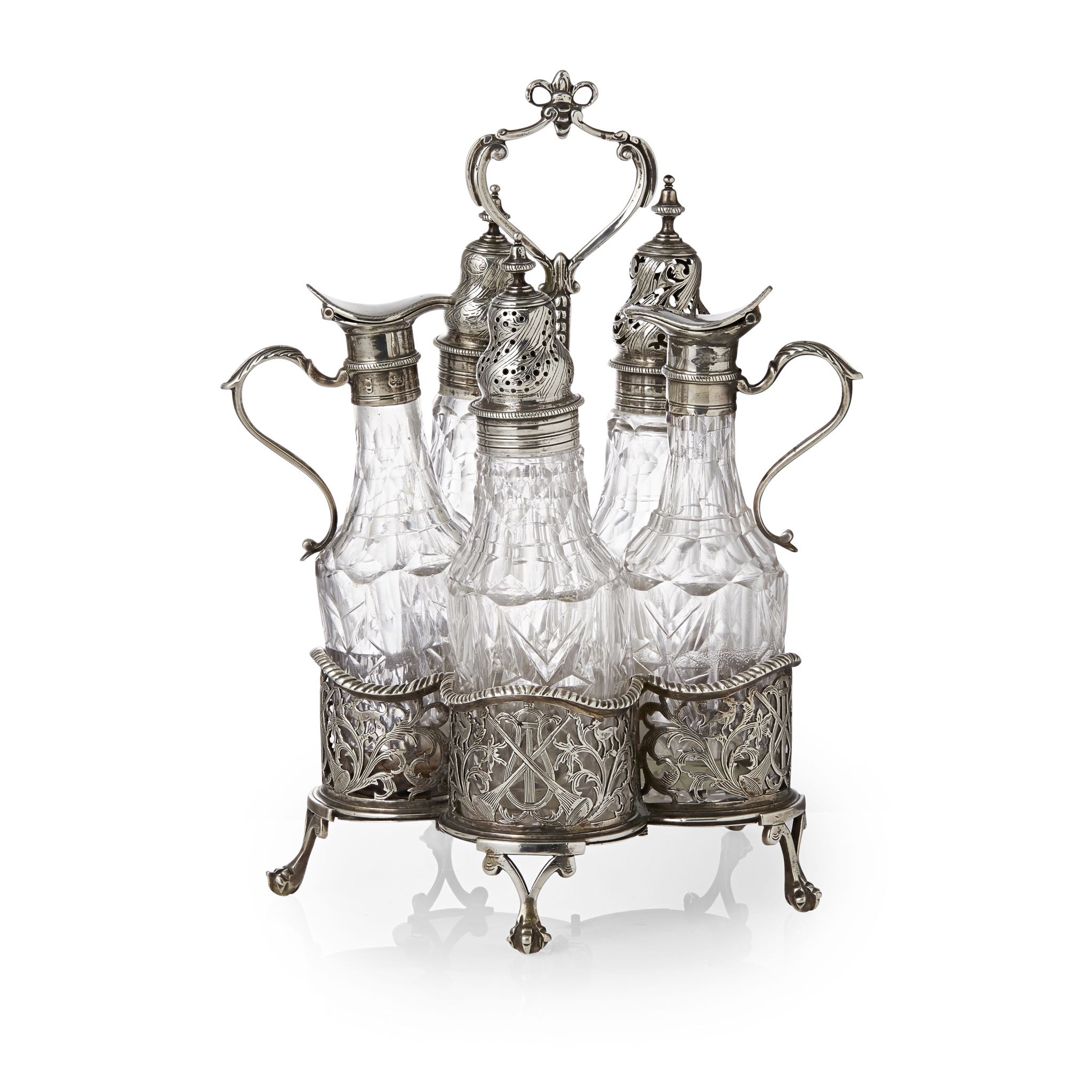 the base for London 1775 and additionally, William Davey, Edinburgh 1775, of moulded cinquefoil form, the gallery pierced and gadrooned border, central handle with loop, crest and motto to cartouche, cut glass bottle with various silver mounts, all raised on four ball and claw feet