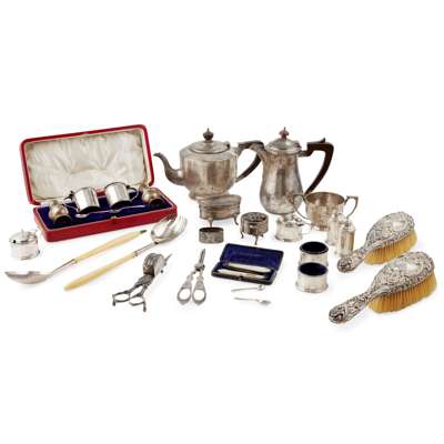 Mackay & Chisholm, Edinburgh 1937, each of squat circular form, engraved Gothic S to centre, angular handles, raised on a circular foot with a baluster water pot, Birmingham with matching Gothic S to centre; together with a cased four piece condiment set, Birmingham and another six piece cased set of condiments, Birmingham, retailed by Davidson, Henderson & Sorley, Glasgow; together with a cased set of fruit knives, various trinket boxes, a plated napkin ring and cased set of dressing table brushes, engraved monogram to reverse, a cased set of Victorian bone handled servers, London crest engraved to bowls a cased plated pair of grape scissors; a plated pair of wick trimmers