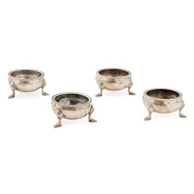 Robert Luke, three marked RL twice and one RL thrice to underside, of traditional bellied cauldron form with rope twist border and raised on three stepped hoof feet, the underside of bases engraved with original initial ‘JM / C’