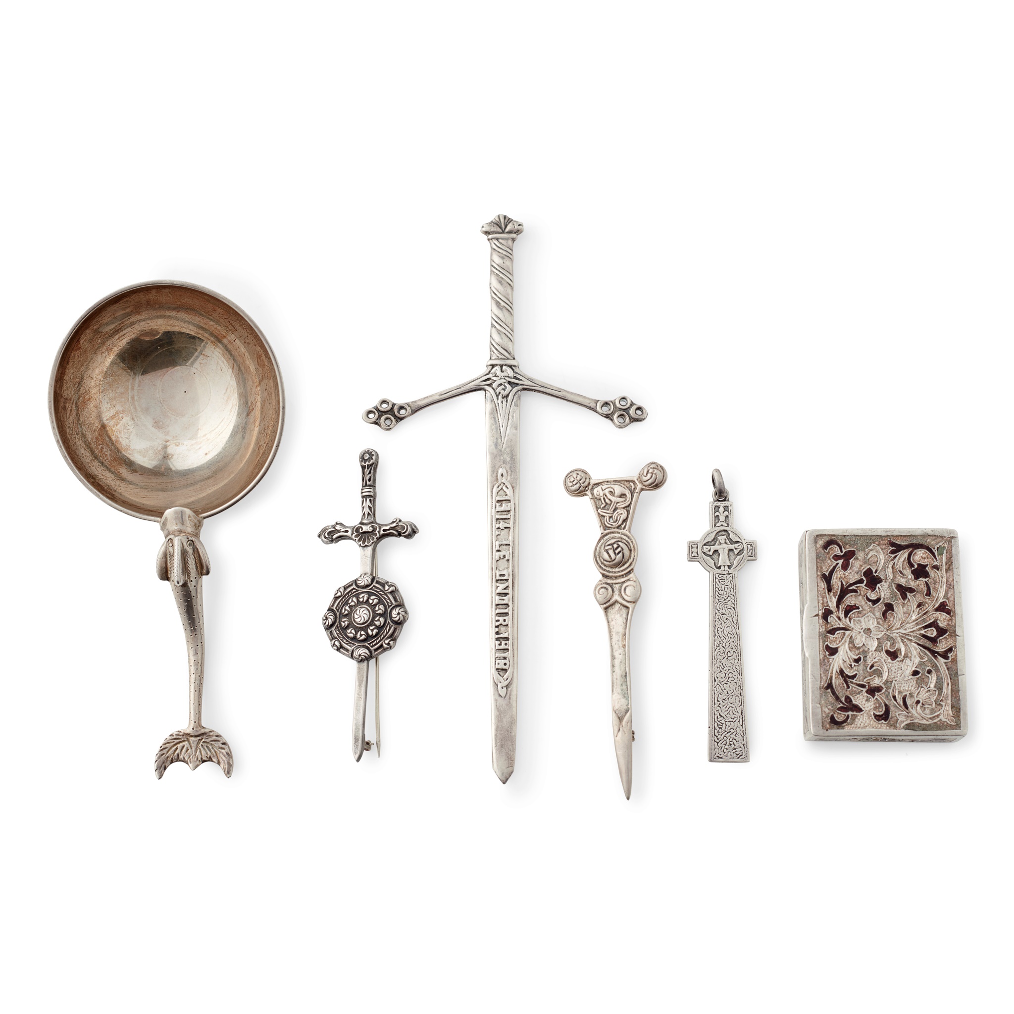 to include, Alexander Ritchie letter opener, marked IONA AR and registration number 645370, modelled as a claymore sword, embossed decoration, '1914 LE ONOIR.1918' to blade; together with a Alexander Ritchie Celtic cross pendant marked IONA AR, modelled as a copy of McLean's cross with fine Celtic knot work and knight on horseback; a Traprain Law ladle, Brook & Sons, Edinburgh 1926, the handle modelled as a mythical sea animal; two Celtic kilt pins, the first Robert Allison, Glasgow 1947 modelled as a sword and targe, the second, marked SILVER, CAI (for Celtic Art Industries) and an unmarked foliate enamel set snuff box