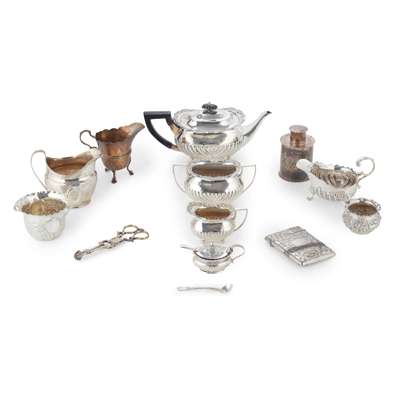 to include; a three piece bachelor's tea service, EH, London 1898, of small size, demi ribbed and cast border, a small tea caddy; three other cream jugs; a George III cream jug, bright cut engraving; a pair of Georgian sugar tongs of scissor action; card case and a mustard pot