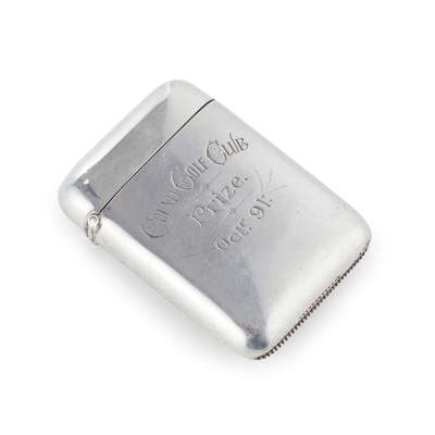 Deakin & Francis Ltd Birmingham 1891,of traditional rounded rectangular form, hinged lid, the body with enamel depiction of 'Old Tom Morris at top of swing to one side, presentation engraving to the reverse, 'County Golf Club/ Prize/ Oct 91'