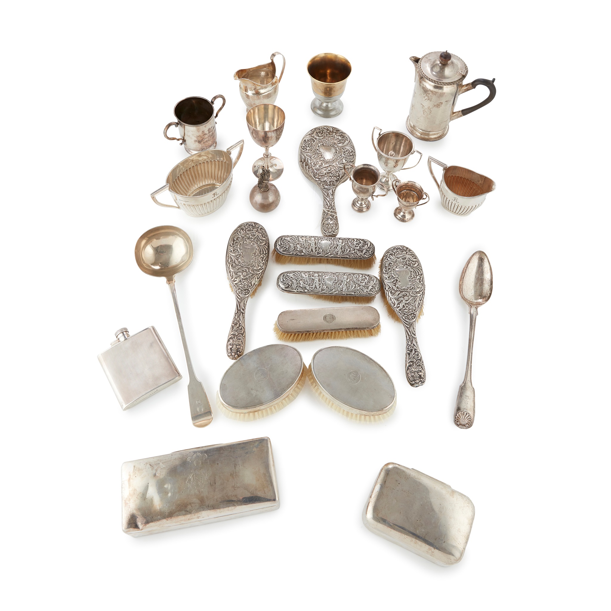 to include, a Victorian christening mug, Robert Hennell, London 1876, of plain form, engraved inscription, plain handle collet foot; a water pot, Birmingham, 1901, of plain cylindrical form, gadroon edge and engraved crest; a hip flask, engine turned decoration; a George III cream jug, bright cut engraved decoration; two table cigarette boxes; a group of small trophies including one modelled on a flaming grenade; an early 19th century soup ladle, Fiddle pattern and a Fiddle Thread and Shell pattern serving spoon; together with a plated sugar and cream jug