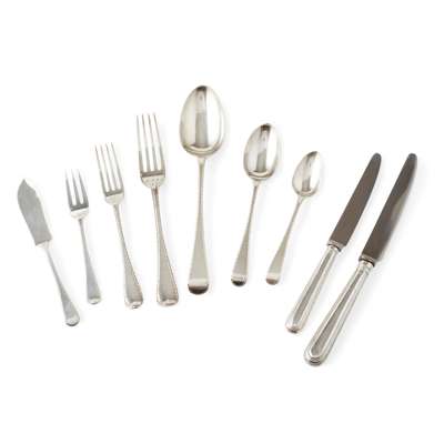 various makers and marks, all of Old English Feather Edge pattern, comprising sixteen tablespoons, twelve table forks, twelve desert spoons, twelve desert forks, twelve teaspoons; twelve table knives, twelve side knives; together with a set of twelve fish knives and forks, C F Hancock & Co, London of similar pattern