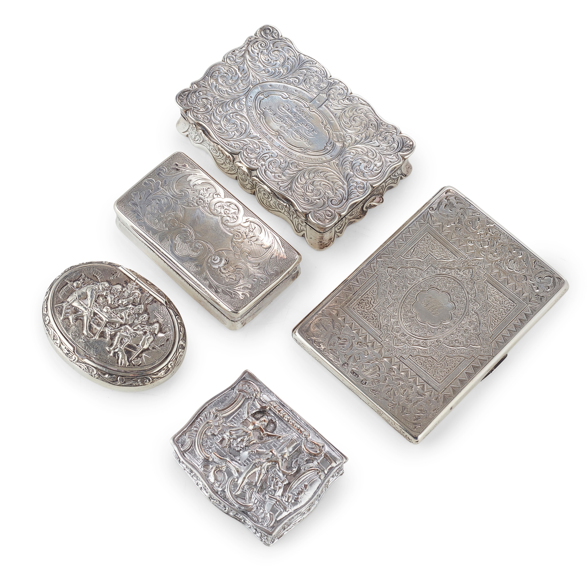 Neill and Cook, Birmingham 1861, of serpentine rectangular outline, the round all over engraved with scrolls, central belt framed cartouche engraved with inscription dated 1861, together with a Victorian silver small note case; three other rate 19th century central European snuff boxes
