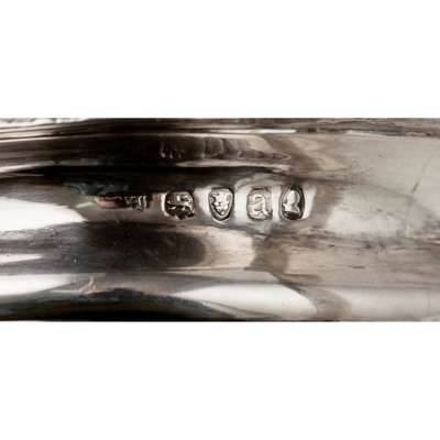 WH, (possibly William Hunter), London 1863, of lobed baluster form, engraved and chased foliate detail to body, with oval cartouche to centre and engraved monogram to one side, the S scroll handle with similar detail, the domed lid with bud finial, all raised on four bracket and paw style feet; together with a teapot, indistinctly marked, of oval demi-fluted form, presentation engraving to lid and all over engraved floral detail, raised on four bracket feet; together with a George III twin handled sugar basin and milk jug 1816, of oval demi-fluted form with gadrooned border, crest to centre, all raised on four ball feet