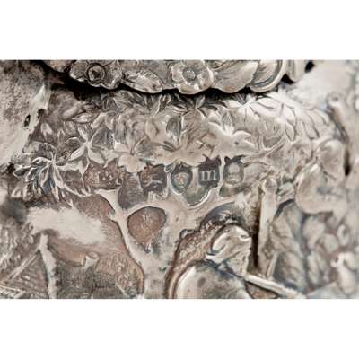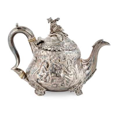 Edward Farrell, London 1827, of pear shape, the hinged lid with a finial of a Chinese man amid a landscape, the body with allover Chinoiserie style decoration of figures in a landscape, all on volute feet, scroll handle, shell clasped spout