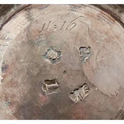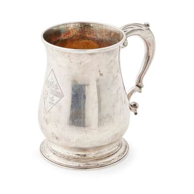 Thomas Whipham, London 1746, of plain baluster form, leaf clasped scroll handle, engraved armorial to front, stepped base, engraved scratch weight 16-11