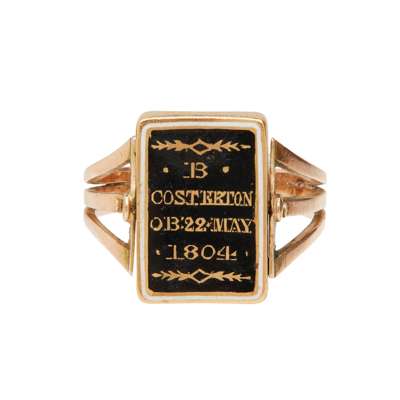 the swivel panel of rectangular form, set to one side with an enamelled white Etruscan vase to black background and B/ COSTERTON/ OB 22 MAY/ 1804 to the other side, all to an unmarked yellow metal shank with split shoulders