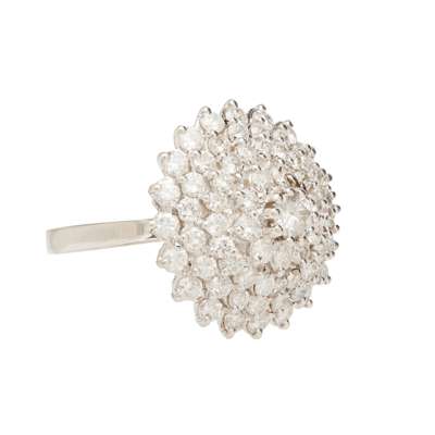 modelled as a domed cluster, claw set throughout with graduated round brilliant-cut diamonds (one deficient), to a plain shank