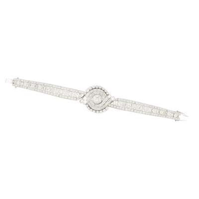 set with a central round-cut diamond, in a scrolling surround set with old round and baguette-cut diamonds, the articulated bracelet with a central row of alternating baguette and graduated round brilliant-cut diamonds, in an outer border of round-cut diamonds, to a concealed clasp and safety clips