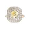 millegrain set with an old cushion-cut yellow diamond, in a double border of eight-cut and old-cut diamonds, to a plain unmarked shank; with accompanying report by Gemmological Certification Services, dated 16.01.2019, numbered 79195-30, stating that the principal diamond is approx. 1.50cts, Fancy yellow, VS1/VS2 clarity