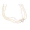 composed of three graduated rows of cultured pearls, the clasp modelled as a star, set throughout with old cushion-cut diamonds, to an unmarked yellow metal detachable fitting with pendant loop
