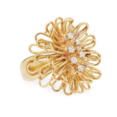 modelled as a floral spray, claw set to the centre with six round brilliant-cut diamonds, to a plain 18ct yellow gold shank