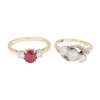 claw set with three graduated old round-cut diamonds, the scrolling shoulders each millegrain set with two eight-cut diamonds, to a plain white metal shank stamped 18 PLAT; together with a ruby and diamond set three stone ring, claw set with an oval-cut ruby, flanked to either side with a round-brilliant cut diamond, to a plain 18ct yellow gold shank