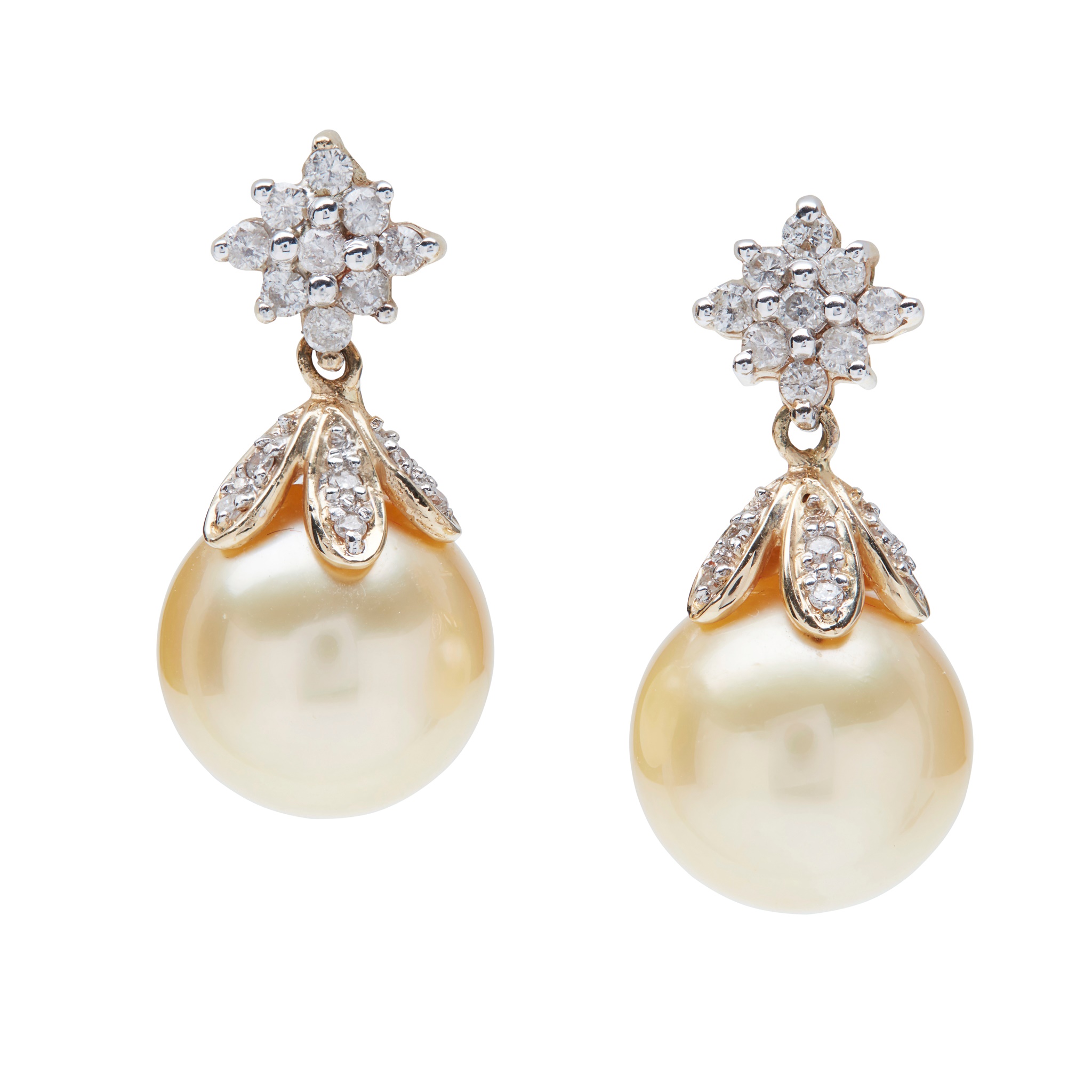 each composed of a cluster of nine round brilliant-cut diamonds, suspending a golden cultured pearl from a diamond set mount, to post and butterfly fittings, stamped 14k