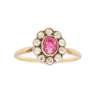 millegrain set with an oval-cut ruby in a border of eight-cut and old round-cut diamonds, to a plain yellow metal shank