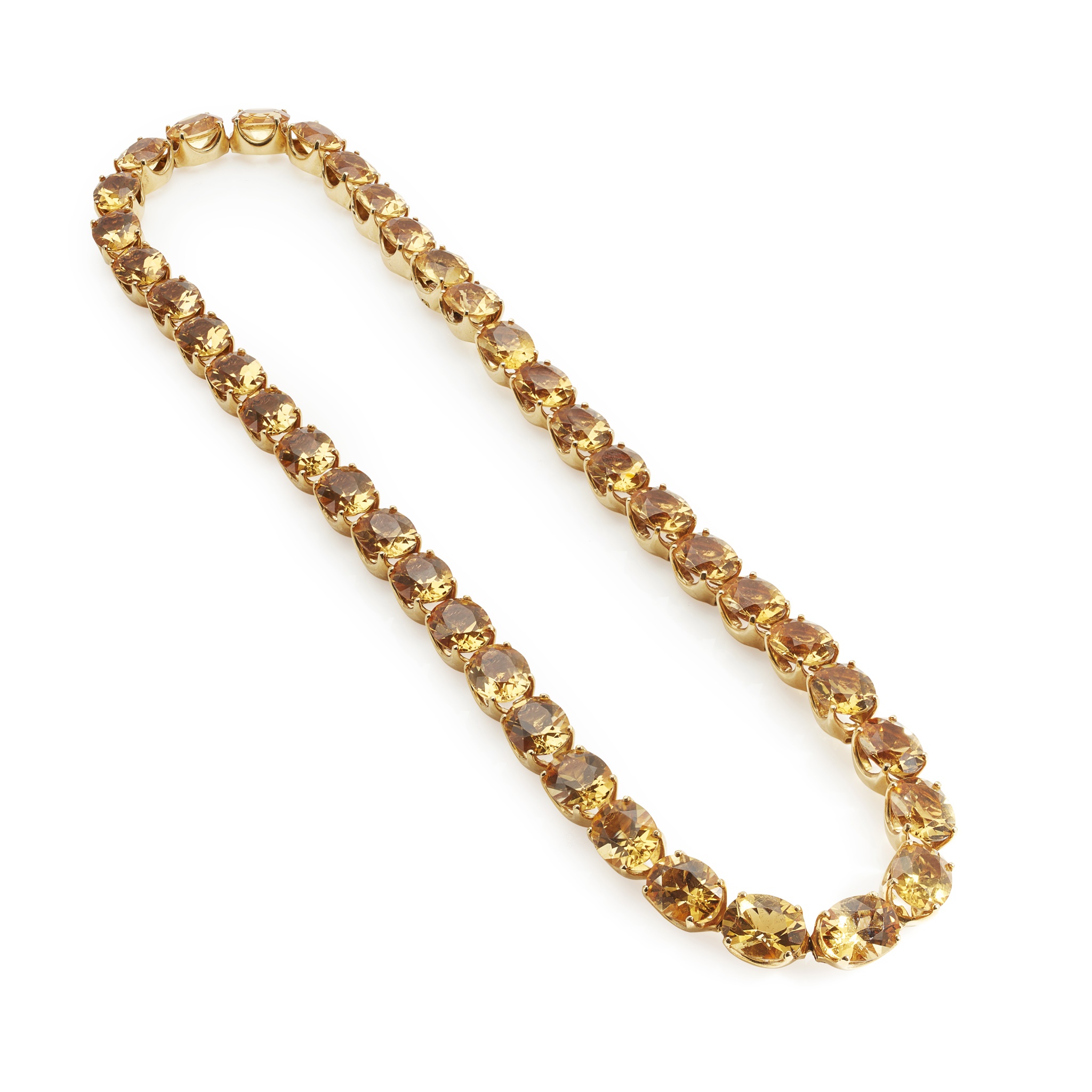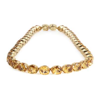 claw set with a row of forty oval cut citrine set links, to a concealed clasp set with a small round brilliant cut diamond to the reverse, stamped 750