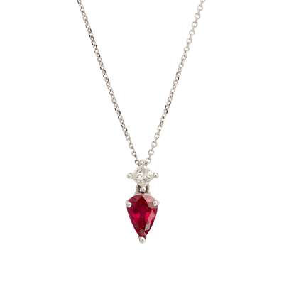 claw set with a princess-cut diamond, suspending a pear-shaped ruby, to an 18ct white gold trace link chain