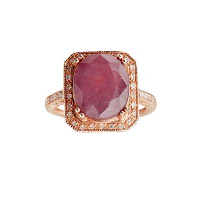 claw set with an oval mixed-cut ruby, in a rectangular border of eight-cut diamonds, each shoulder similarly set, shank is stamped 14k 585