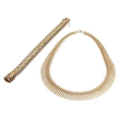 of broad design, with bright-cut detail and concealed clasp and safety clips; together with a 9ct gold fringed necklace