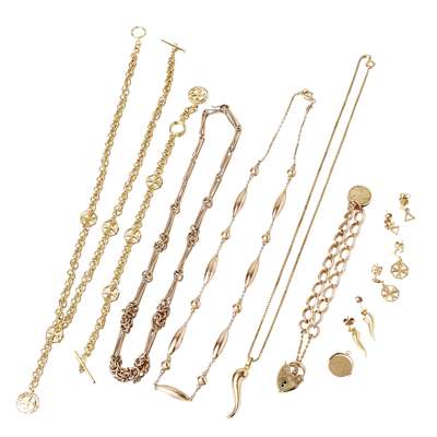 to include 9ct gold 'chilli pepper' pendant to a box link chain, together with a pair of matched unmarked earrings; a 9ct gold curb link bracelet; various other unmarked yellow metal necklaces, bracelets and earrings